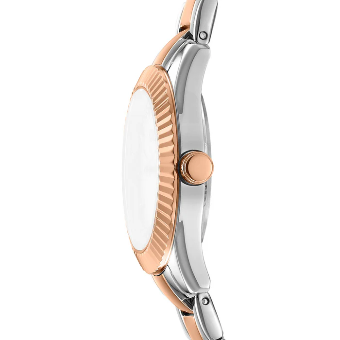 This elegant 30mm timepiece combines a silver and rose gold two-tone stainless steel bracelet with a matching silver dial. Powered by precise Japanese quartz movement and offering 5 ATM water resistance, it blends luxury with everyday functionality. The sophisticated two-tone design creates a versatile accessory that transitions effortlessly from professional settings to evening elegance.